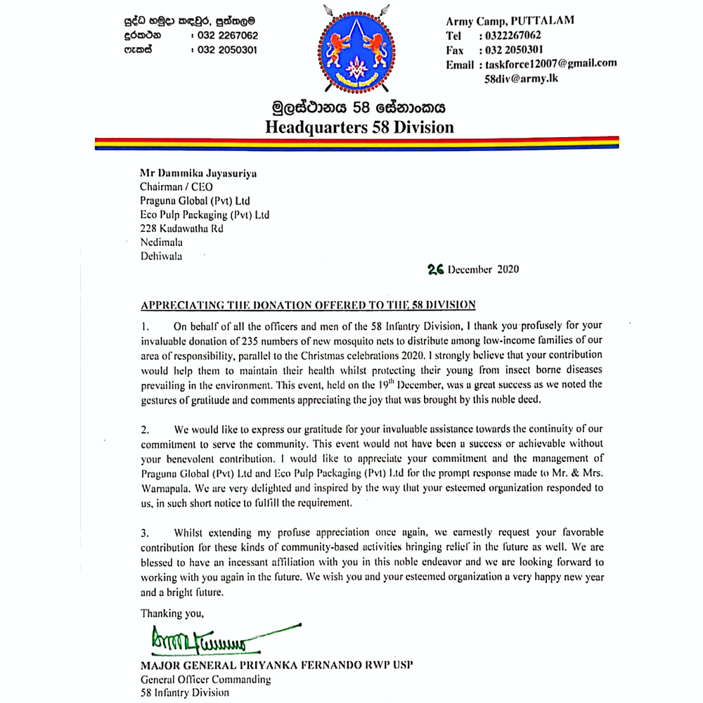 Praguna Global donated Mosquito nets for the 58th infantry division of Sri Lanka Army, under Christmas celebration & new year CSR initiative. The nets were distributed among the low-income families and appreciated by the General officer commanding 58th infantry division Major General Priyanka Fernando.